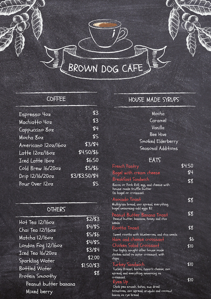 Finally, for something a little more indulgent, the Coffee Food items are definitely worth exploring, combining the richness of coffee with other sweet and savory flavors to create an enjoyable and unique experience. Whether you are stopping by for a quick bite or spending some time relaxing, Brown Dog Café provides a variety of tasty options to suit any craving.